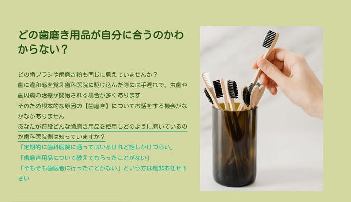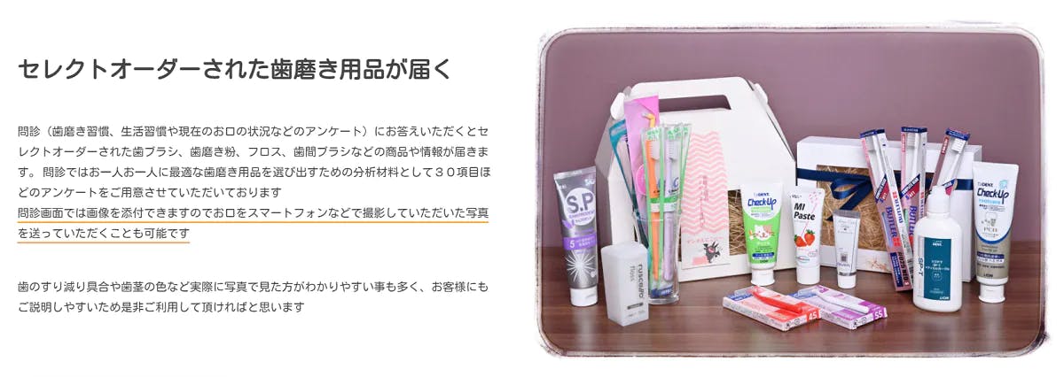 ウェブ上で歯科衛生士が歯磨き用品のオーダーセレクト処方を行ったりお一人お一人の生活習慣や食事、嗜好品や歯並びを含めた歯磨きの仕方を専用に御考案する活動をしております。