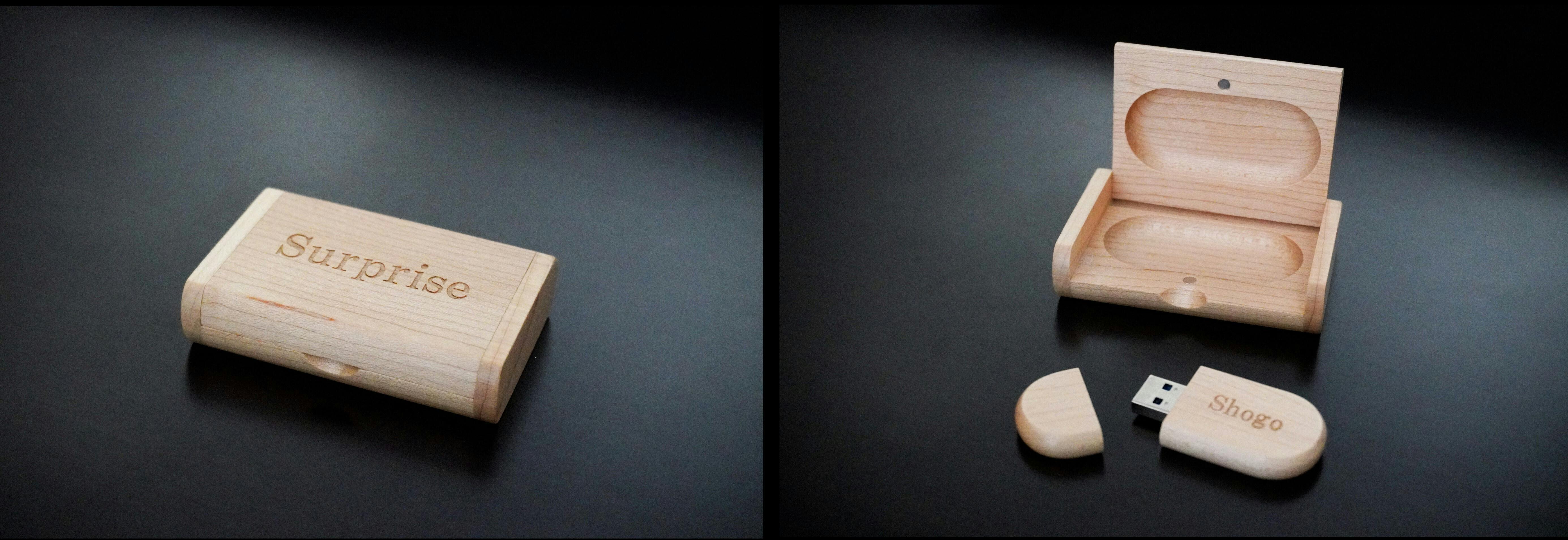④にて発送するUSBのイメージ(USBには支援者様のお名前を入れさせて頂きます。箱には「Surprise」の文字を入れさせて頂きます。不要の方は備考欄にてご記入願います。)