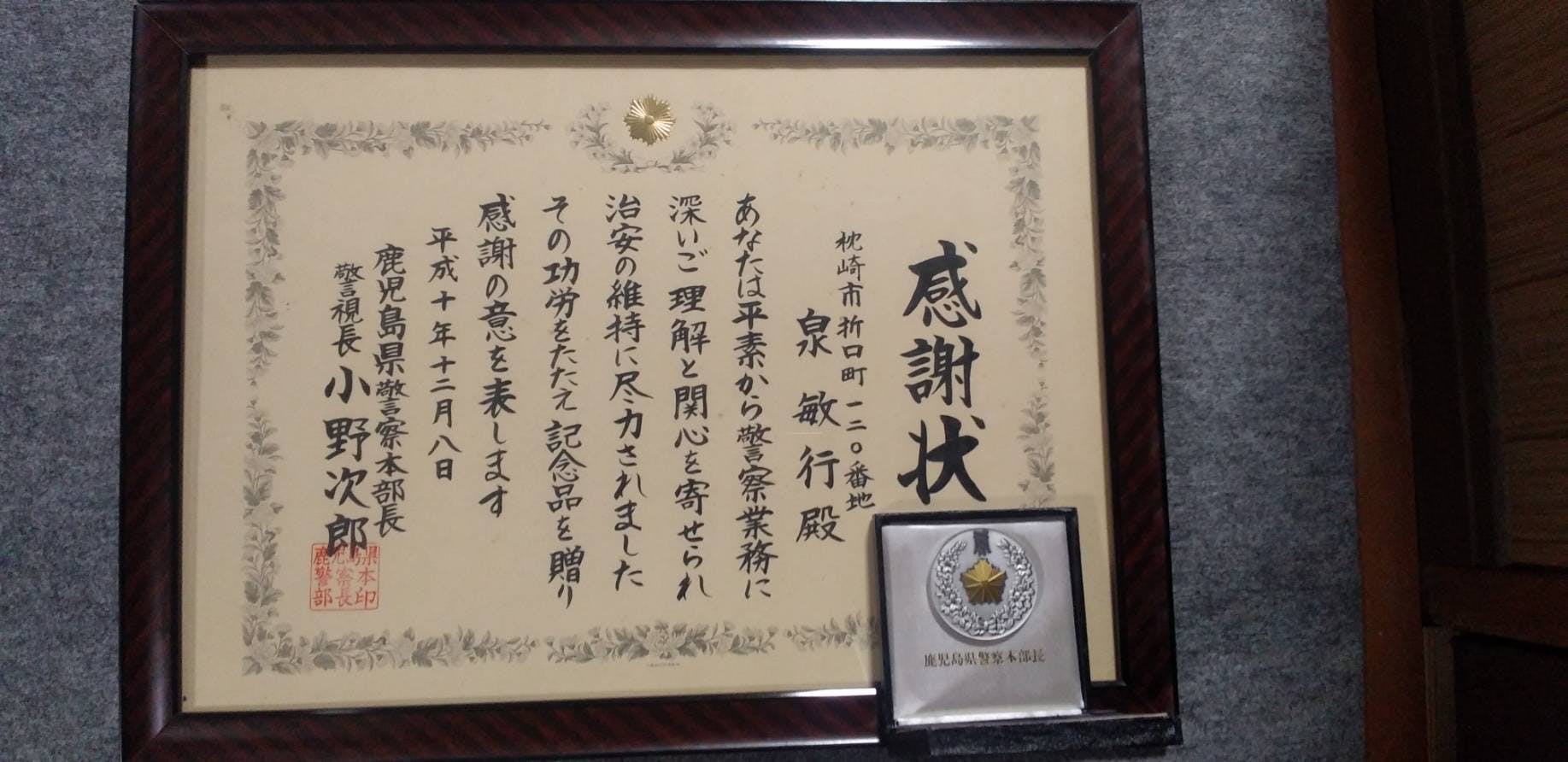 その業績に対し鹿児島県警から感謝状を頂きました。
