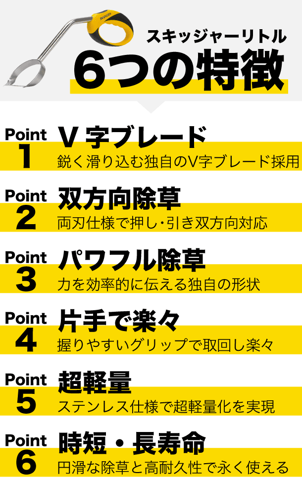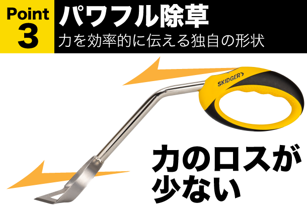 スキッジャーは力を最大限伝えられるよう独自の設計がされています。計算され尽くされたこの形状は力のロスを極力減らし、少ない力でも効果的に除草が出来るようになっています。
