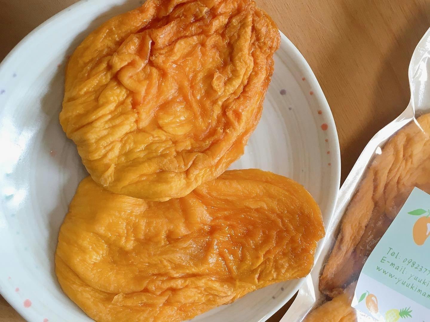 台南の夏のルビーと呼ばれているくらい地元の方に大切に育てられているアップルマンゴー。太陽がどのマンゴーも均等にあたるように急斜面の山に生えています。マンゴーはとても手間がかかるフルーツですが愛情を込め育てています。樹の上で完熟になったマンゴーを丁寧に洗い、皮を向き種をとり、お砂糖をはじめとする添加物は何も加えず専用機械に入れて低温で約2日かけてドライフルーツにしています。柔らかくマンゴーの芳醇な香りがする一番人気のドライフルーツです。ドライマンゴー一枚には、マンゴー半玉使用しています。1袋200グラムのドライマンゴーに8玉前後のマンゴーを使用しています。