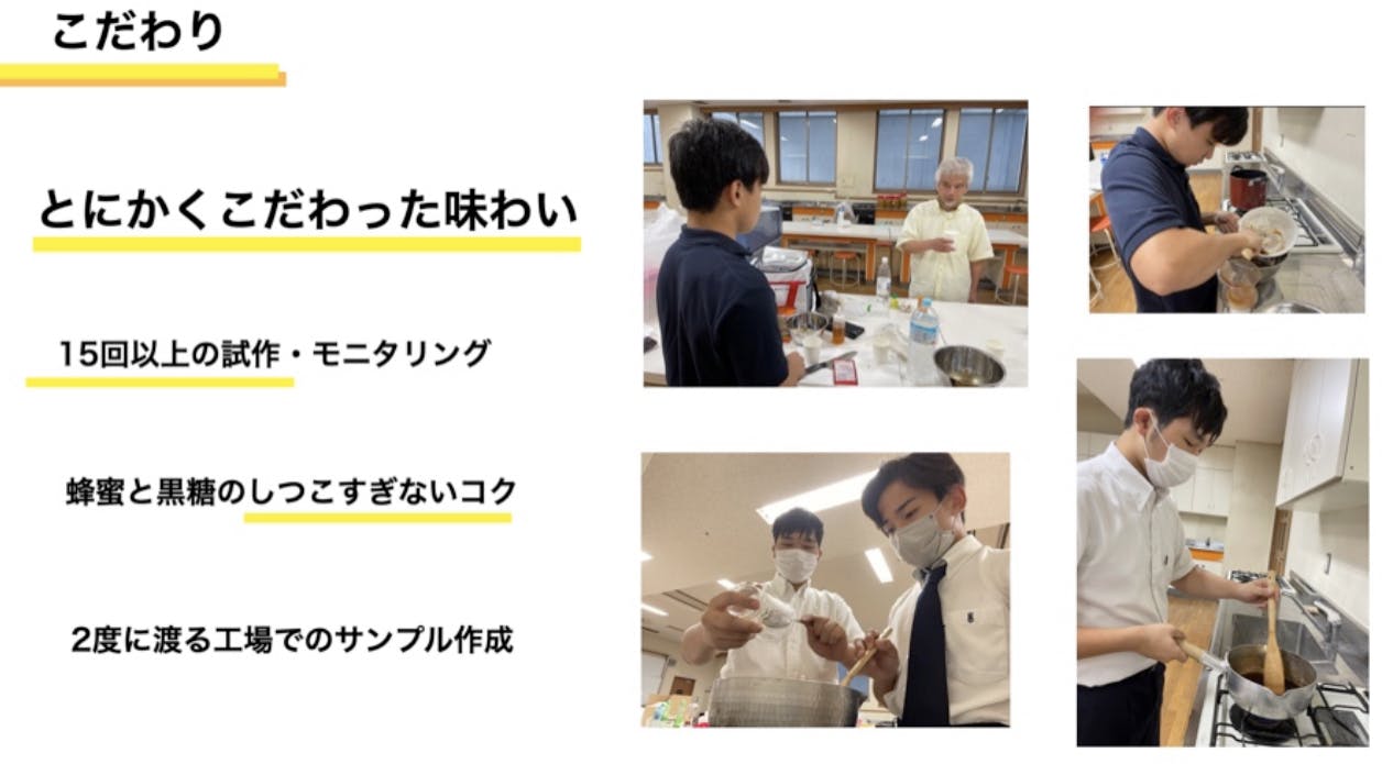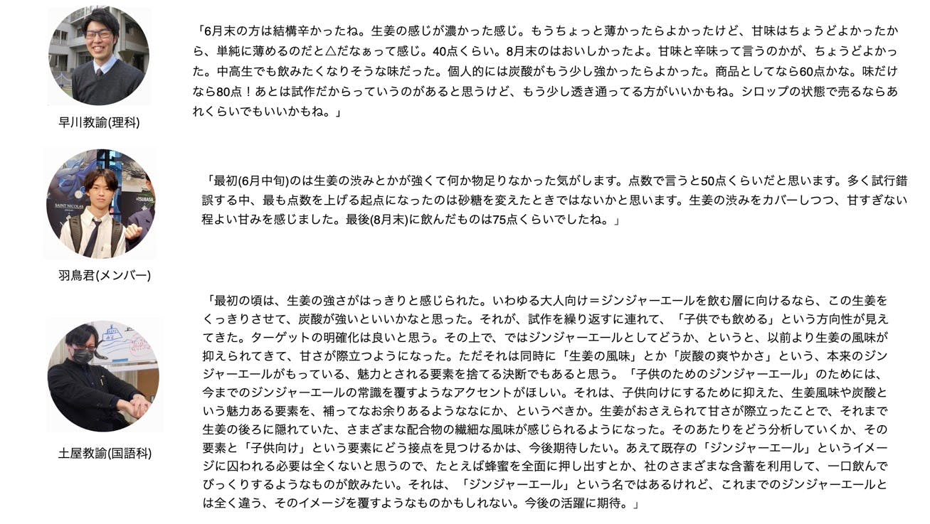 6月から始まった商品開発ですが、最ものこだわり、時間を費やしたことはレシピ作りでした。1からレシピを作り上げ、一般的なジンジャーエールには使用されない黒糖の使用やグラニュー糖とのブレンド、はちみつの文量や生姜の辛さなど計15回以上の試作・モニタリングを夏休み期間に投稿して繰り返し行いました。また、商品のターゲットととして大人や中高生が楽しめるようにするのか、それとも子供向けに甘くするのかといった点でも試作を繰り返しました。最終的には、子供でも楽しめるように辛くないジンジャーエールに仕上げました。↓試作品のレビュー