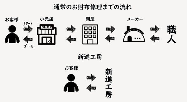 お財布はお客様の手に届くまでに多くの中間マージンや物流コストが発生しています。それに比べて新進工房の仕組みはシンプルです。