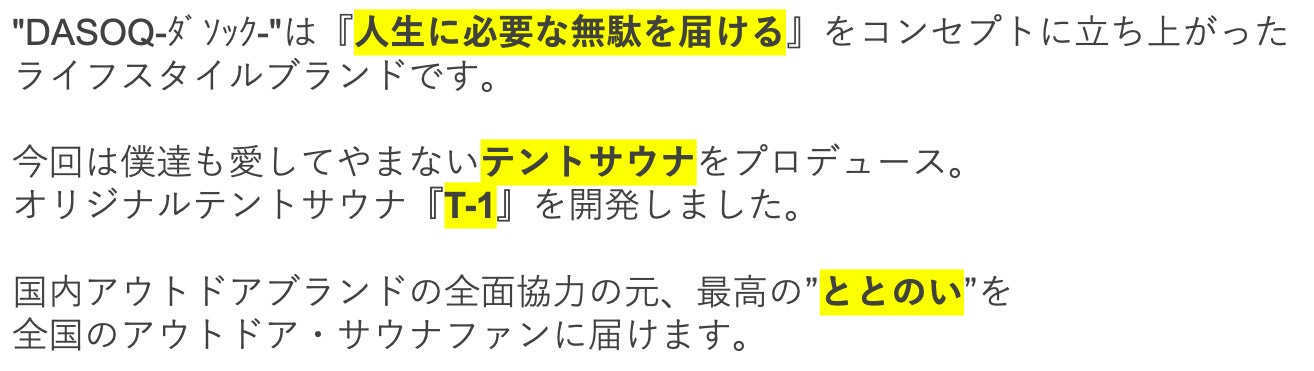 『人生に必要な無駄を届ける』というコンセプトのもと、DASOQではテントサウナを第一弾商品としました。