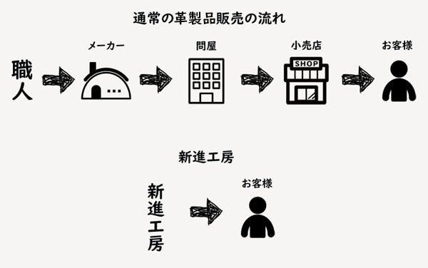 革製品はお客様の手に届くまでに多くの中間マージンや物流コストが発生しています。それに比べて新進工房の仕組みはシンプルです。