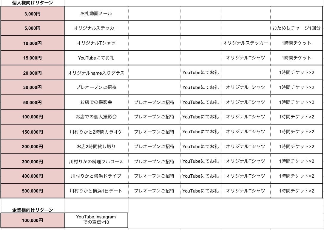 2021/12/07 19:58皆さんにご報告です!!!この度、皆さんのご支援のおかげ様で私の愛する横浜関内に待望のCAFE&BARをオープンすることになりました!!!( ; ; )!!!内装はまだまだ手付かず、お酒の種類なども初めのうちは揃えられなかったりCAFEの運営までもう少し時間はかかりそうで自分の理想とはまだまだ程遠いですがなんとか、、、なんとか店舗のGETまで漕ぎ着けました( ;∀;)みんなと会える!集まれる!!!開業レベル1の川村ですが記念すべきLapin生誕祭に来て頂けるととても嬉しいです!!!---------------------------------------------------------Lapin ChampignonOPEN: 12月26日(日)12月26日(日) 11:30〜15:00 20:00〜24:0012月27日(月) 11:30〜15:00 20:00〜24:0012月29日(水) 11:30〜15:00 20:00〜24:0012月30日(木) 11:30〜15:00 20:00〜24:00オープン予定が間近と言うことで4日間設けさせて頂きました。プレオープンは昼の部になりますので、プレオープンご招待のリターンでない方は夜の部のみになります。☆予約方法☆12月12日(日)12:12よりご予約開始!!!店内がとても狭い為、完全予約または紹介制となりますので御来店の際はお店のInstagram【https://www.instagram.com/lapin_champignon/】のDMにて・お名前・日にち・時間・人数の記入をお願い致します。お店の質問などもこちらのDMにてお願い致します。※Instagramのアカウントをお持ちでない方は【lapin.champignon.reserve@gmail.com】に上記の記入をお願い致します。メールの方は返信が遅くなることをご了承ください。☆住所☆※非公開となります。ご予約いただいた時点で場所などお伝え致します。関内駅から 徒歩10分馬車道から 徒歩4分日本大通り駅から徒歩4分☆システム料金☆①飲み放題プランa.60分 6,000円b.フリータイム 13,000円ハウス焼酎・ウイスキー(ミネラル・ウーロン・乾き物付)②ボトルキープ制 セット料金プランa.60分 6,000円b.フリータイム 13,000円(ミネラル・ウーロン・乾き物付)③ドリンク単品プラン60分 4,000円※延長30分2,000円(自動延長制)※税・サービス料別途10%・この4日間だけ昼の部もBAR特別プランでやらせて頂くことをご了承ください。・チャージリターンの方は500円引きになります。・1時間券リターンの方はこの4日間のみ昼夜お使えになりますが 1日1回までとさせて頂きます。・ランチなどご用意はないのでこの4日間のみ[食べ物限定持ち込み&出前OK] にします!こちらでご用意できなくてすみません(>人<;)尚、全てのチケットの期限は2022年2月末までに変更させて頂きますので今回予定が合わない方は別の日でもお使いなれますので心よりお待ちしております。---------------------------------------------------------ワンオペの為、至らない点が多々あるかと思いますが少しずつでも皆さんに愛していただける皆さんが笑顔になれるお店になるために精進して行きますのでよろしくお願い致します!!!!伝え忘れてることないかな_:(´ཀ`」 ∠):2021年大変だった今年も終わりよければ全てよしーーー!!!!!!!な年末を一緒に過ごしましょう♡♡♡ もっと見るクラファンリターンname入りグラスについて