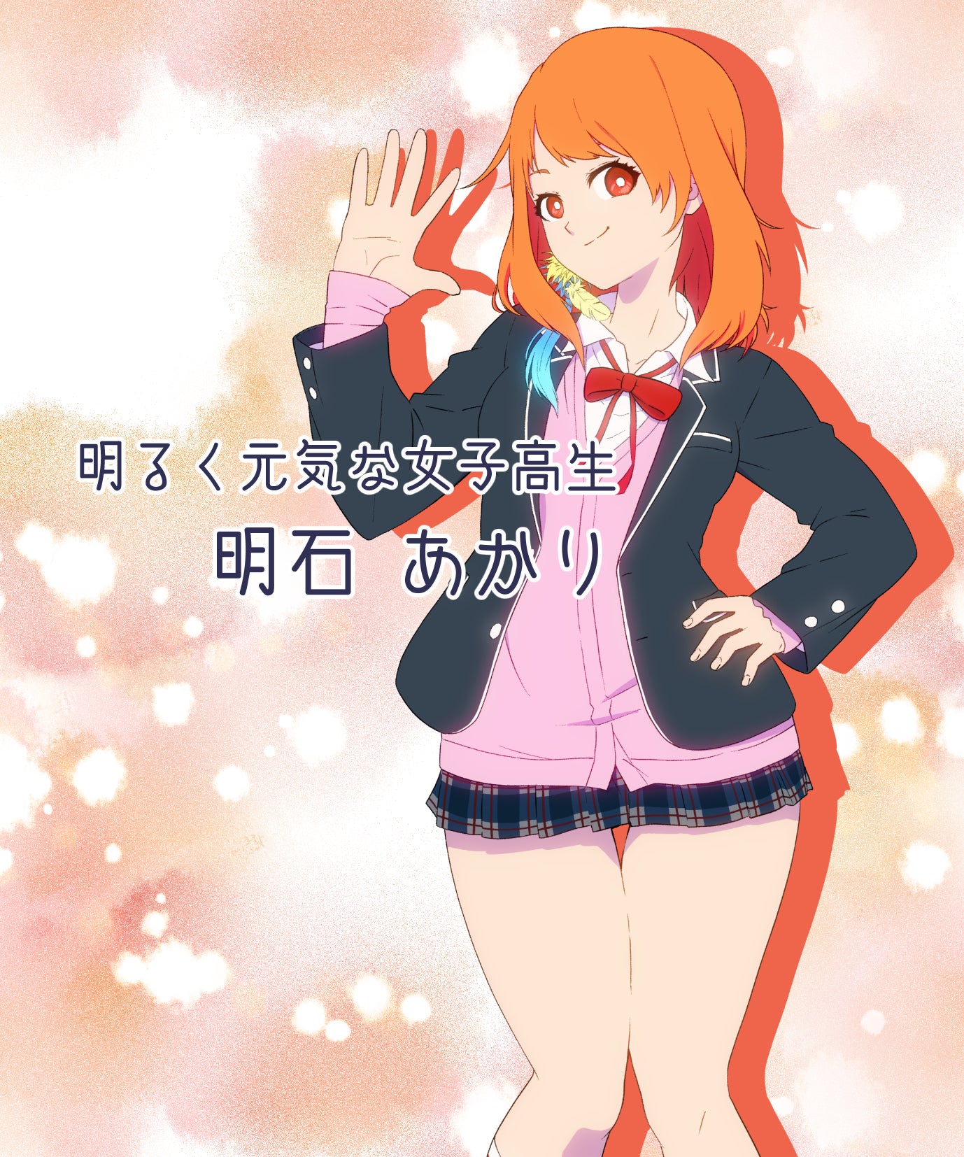 明るく元気な女子高生です。オレンジの髪に赤のインナーカラー、羽根を模した髪飾りが特徴です。