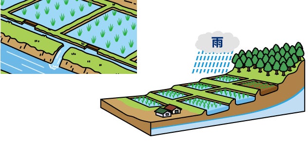 田んぼは、周りをあぜで囲まれており、雨水を一時的に溜めることができます。