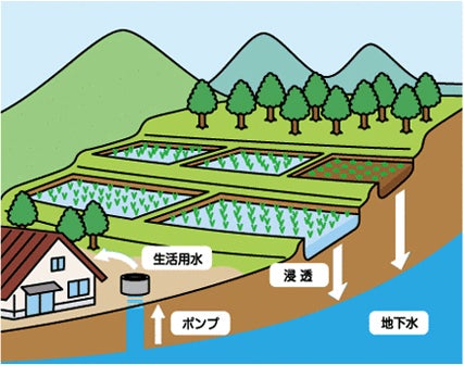 田んぼに溜められた水は、ゆっくりと浸透して地下水になり、下流地域で様々な水として活用されます。