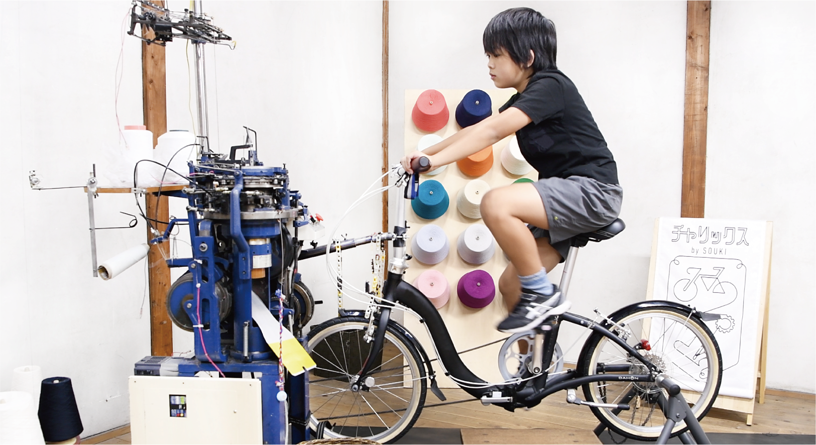 チャリックスは、実際の工場で働いている靴下の編機(あみき)と自転車を融合し、自転車をこぐチカラを使って靴下を編むことができる実用新案も取得した“靴下を編む機械”