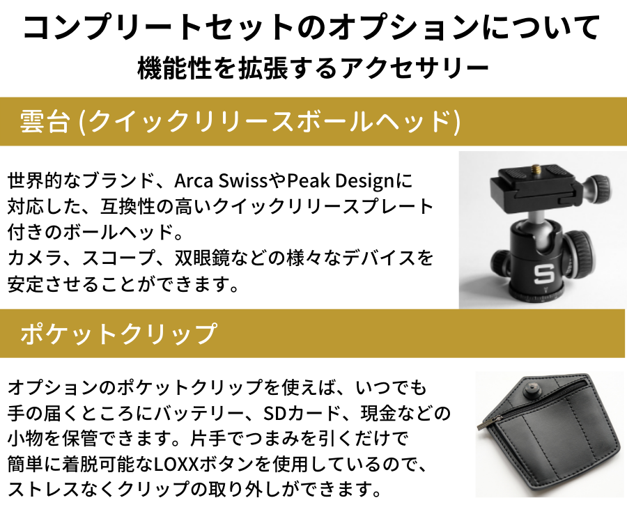 さらにオプションのクイックリリースボールヘッドを使えば、スタビライザーと組み合わせることができたりと可能性は広がります。