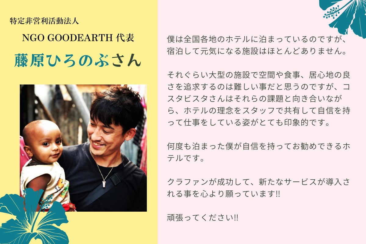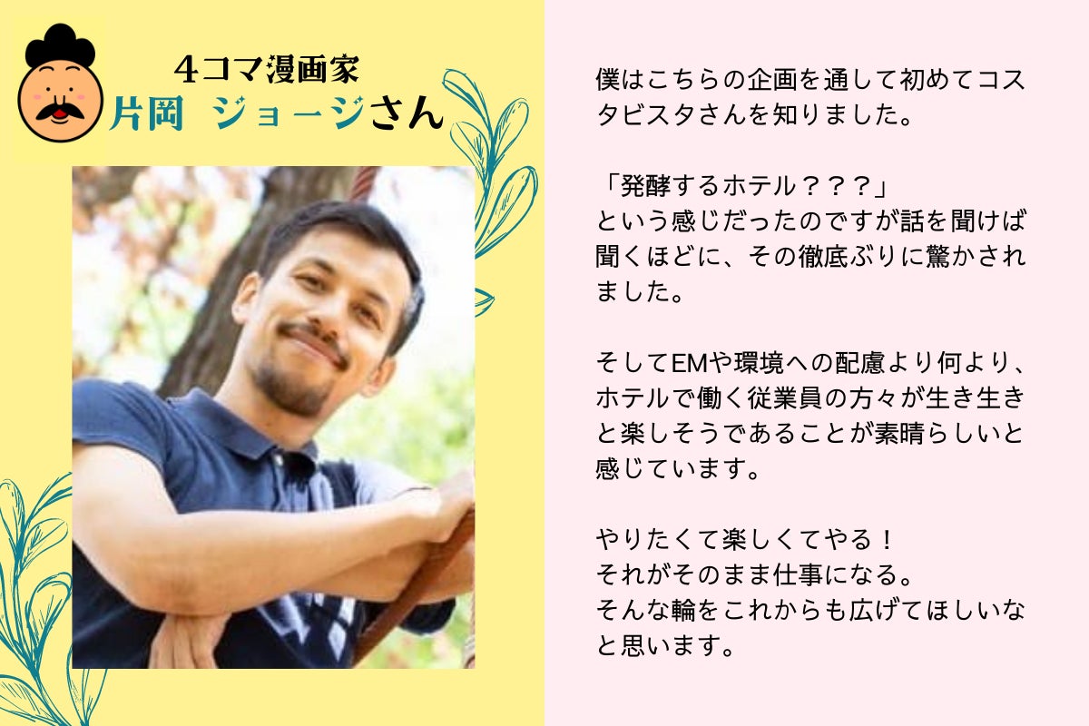 「健康」「微生物」「発酵」「地球環境」という私たちが大切にしてきた取り組みをきっかけに賛同してくださった、コスタビスタファン、EM愛用者、みつろうさんのファン、自然な暮らしを愛する方々が自然と集まり、ホテルスタッフの枠を越えて、プロジェクトに関わってくださっています。職業も年齢も出身地も様々な、奇跡のようなメンバーです。
