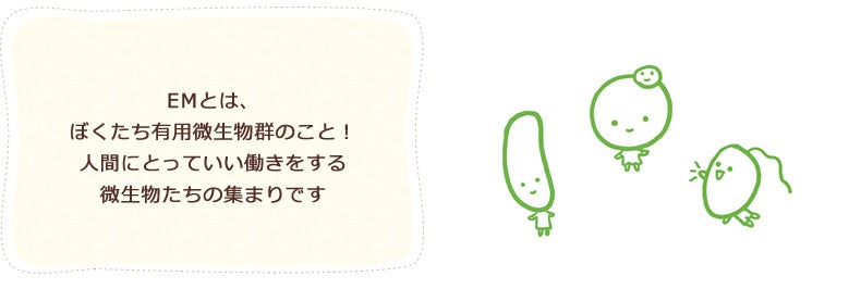 ※1 EMとは、Effective(有用な) Microorganisms(微生物たち)の英字の頭文字をとったもので、乳酸菌や酵母、光合成細菌など人間にとって良い働きをしてくれている菌(微生物)の集まりです。