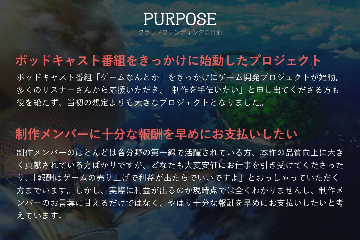 Danが誰にどこまでのお仕事を依頼できるのか、そしていつ仕上がるのかの大きな要素として資金の問題がございます。皆様にご協力いただくことで各担当のクリエイターがのびのびと能力を発揮してくれるはずです。今回ご用意したリターンももちろんそうですが、何より質の良いゲーム体験で皆様にお返しをさせてください。