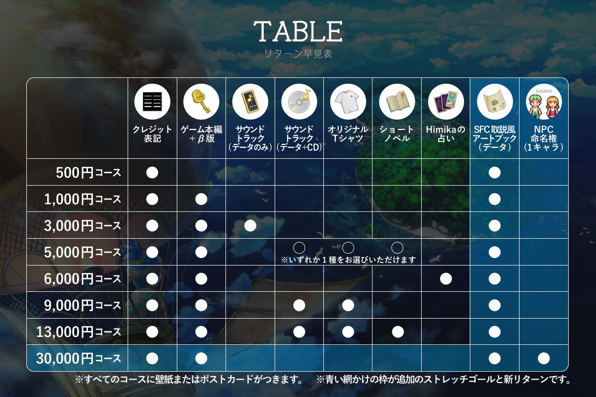 新たな目標としてストレッチゴールを設定いたしました。目標金額200万円(400%)達成で、ご支援いただいた全ての方に、スーパーファミコン取扱説明書風アートブック(PDFデータ)を進呈いたします。また、作中の宿内BGMを多数追加し、BGMをお選びいただけるようになる家具「ジュークボックス」を追加いたします。