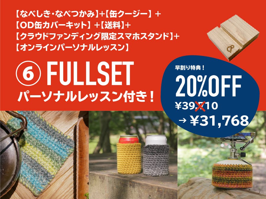 「Potholder/なべしき・なべつかみキット」 「Can Koozie/缶クージーキット」 「Gas Canister Cover/OD缶カバーキット」と「クラウドファンディング限定のスマホスタンド」がついてきて、