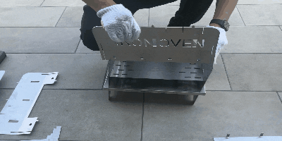 アイアンオーブンはスタンダードサイズ・ミニサイズの2種類の規格がありどちらもすべてのパーツは錆や耐熱性に強いステンレス鋼板の板状の部品から構成されています。組み立ては鋼板をかみ合わせながら組み立てるだけでボルト止めや煩雑な作業は一切不要です。
