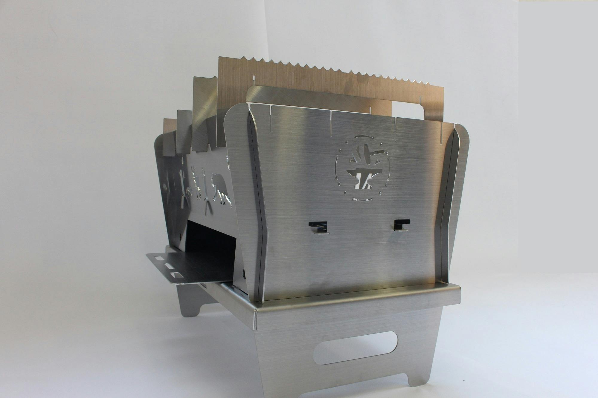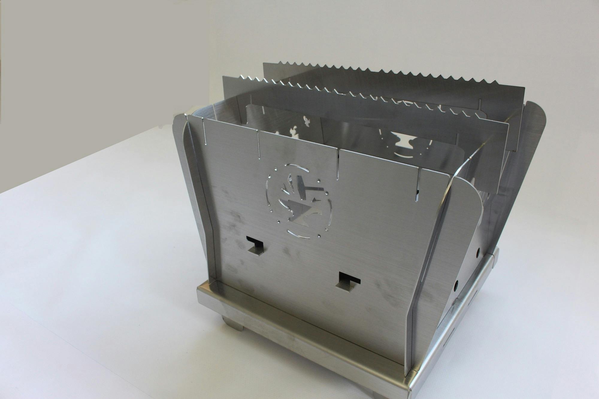 しかしここでまた問題が起きました。軽量化するために厚さを2.3㎜→1.5㎜としたこと、熱の滞留しやすいSUS304の特性により加熱時に製品に非常に大きなゆがみが発生しました。この改良のためモニターとして使用していた同じ当麻町にある木材卸業・加工業である「北央銘木×HOKUON」様から意見を頂きひずみ部に曲げ加工・金物の抑えとしてロック機能を付けるというアドバイスを頂き、北央銘木様にて様々な樹種での燃焼実験を行いました。