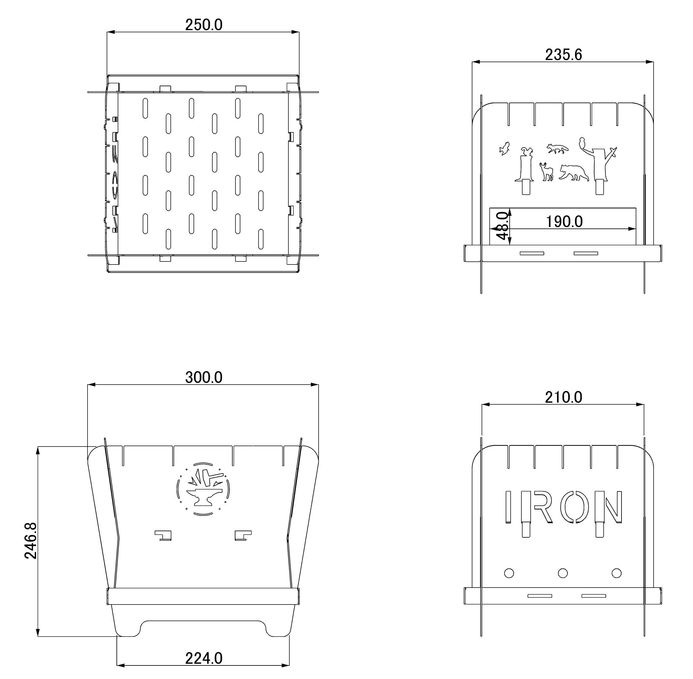 収納時は箱状の底板へすべての部品を収納し、横板(両端)で蓋をして付属ベルトで底板の穴を通して縛ることによりスタンダードタイプで423㎜×307㎜×25㎜、ミニタイプで300㎜×250㎜×25㎜と通常の焚火台と比べ非常にコンパクトに収納できるため場所をとらずに収納・持ち運び可能です。