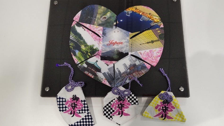 お守り面は市松模様のリボンに『御守り愛』。裏面に5種類の絵を用意しました。①から⑤でご要望はお応えできます。ご要望がない場合は①でおつくりします。壁掛けなどで飾れるようにフレームも用意しました。みんなが集まった時に絵合わせをしてニッコリ微笑んでください。