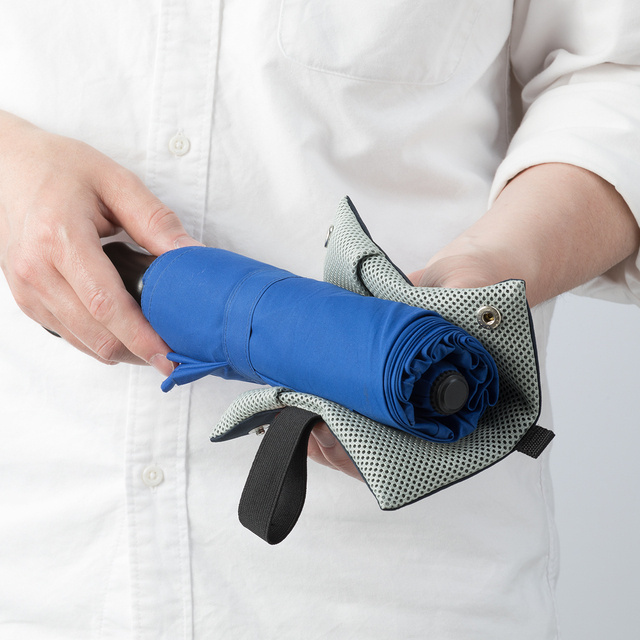 すばやく水滴を吸い取る特殊素材の組み合わせが、濡れた傘をさっと拭き取り、水だれも防ぎます。