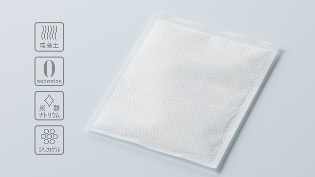 大分県産珪藻土(食品添加物)、シリカゲル、炭酸ナトリウム(食品添加物)を透水性で粉体が漏れない特殊な不織布で封入しました。もちろんアスベスト(石綿)は含有していません。