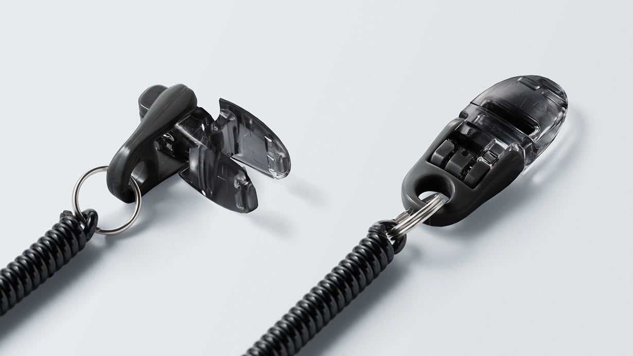 先端を曲げて引っ掛け戻すだけ!ワンタッチで簡単取り付けできるクリップが付属します。本体と傘のネームバンドに取り付けて、落下や紛失も防ぎます。