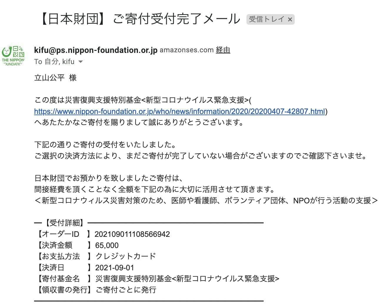 寄付先:日本財団様の「新型コロナウイルス感染症拡大に伴う支援」