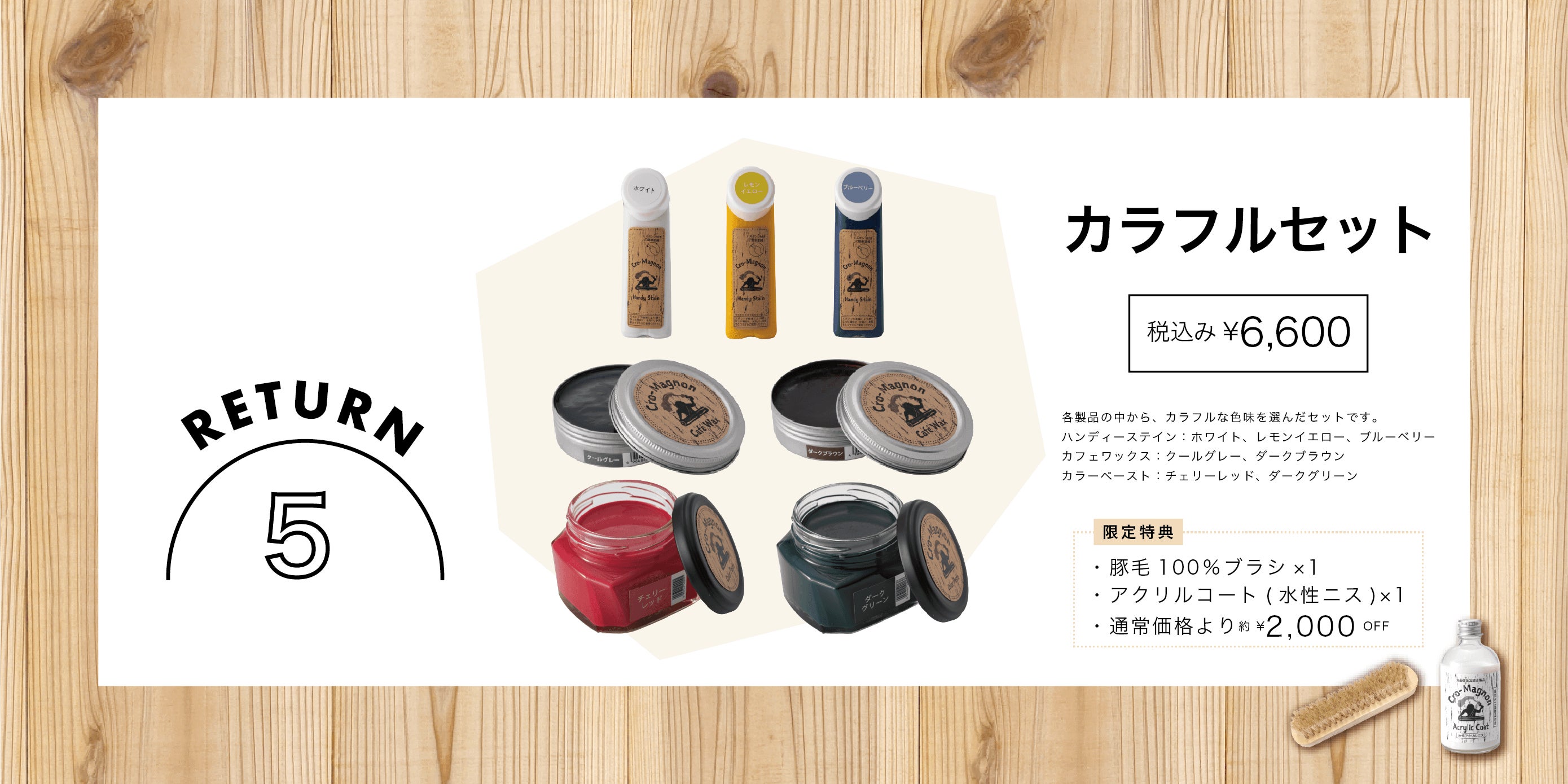 ⇒ハンディステイン:880円(税込)、カフェワックス:880円(税込)、カラーペースト:990円(税込)となります。リターンの「よりどり3つセット」及び「よりどり5つセット」は、お選びする製品によって参考通常価格が異なるため、「〇〇円以上」と表現させていただいております。また、限定特典のOFF金額についても最小金額と最大金額の平均からの割引金額を表記しております。