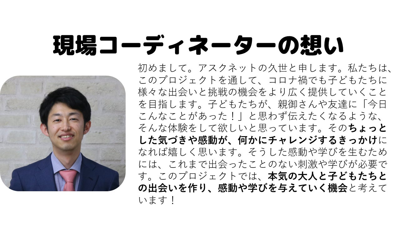 我々としても、学校外のつながりや、地域の大人と交流する機会はこういった社会情勢だからこそ求められると感じます。困っている学校を支援するため、また、その先にいる子どもたちにとって、地域の大人との交流や社会とつながる機会を減らさないために、この活動を進める必要性を強く感じています。
