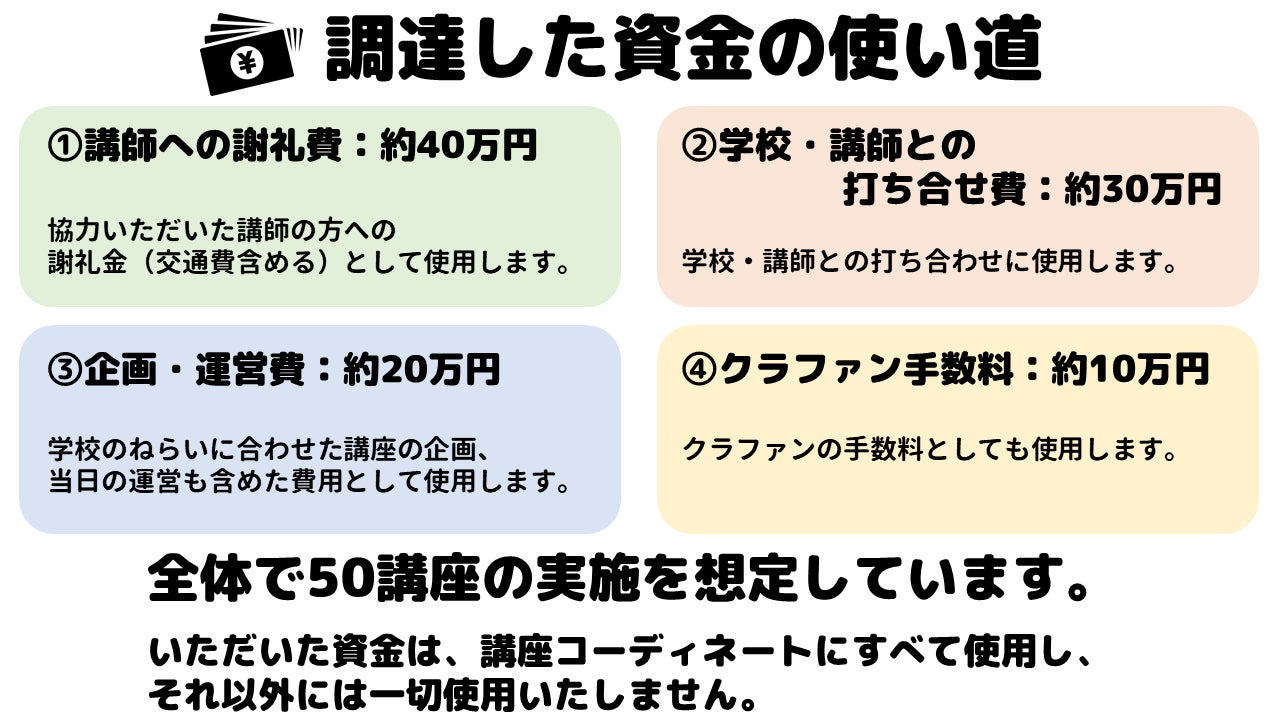 このプロジェクトでは、当初予定していた体験活動等が実施できなくなった学校に対して、学校のニーズに合わせて代替プログラムを実施し、支援を必要とする学校をより広く支援していくための資金としてクラウドファンディングを立ち上げました。