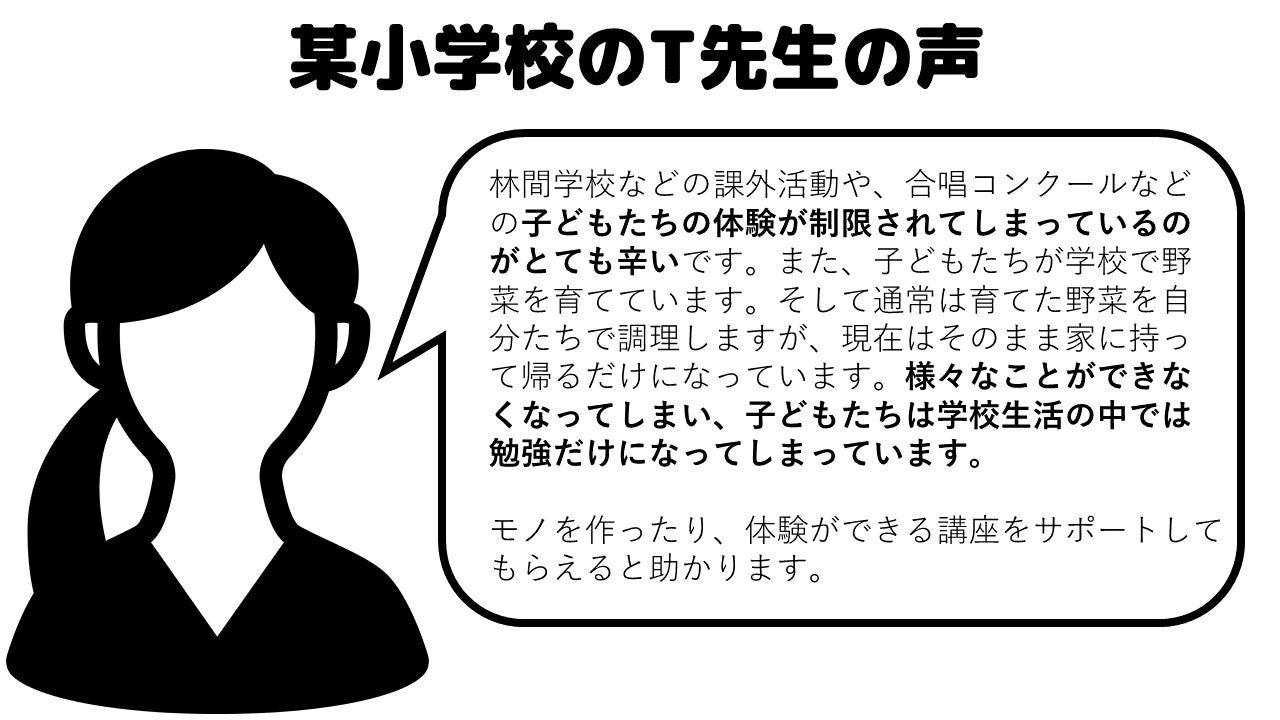 日頃私たちは、外から学校をサポートする立場として先生方と関わらせていただきますが、先生方からも、中止された体験活動に代わって、子どもたちのために何かできないかと相談を受ける場面も増えたと感じます。