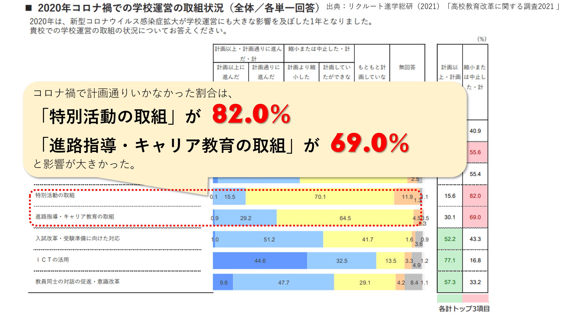 特に学校の外に出て人と交流する職場体験等の体験活動が中止となっている学校も多く、昨今、子どもの体験活動の減少が叫ばれるなか、コロナの影響を受けてさらに学校外の大人との出会いや交流の機会が減ってきています。これまで東海地区を中心に学校と社会をつなぐ教育のサポートを行ってきた弊団体としても、子どもたちの多様な教育機会が減少している事態を重く受け止めています。