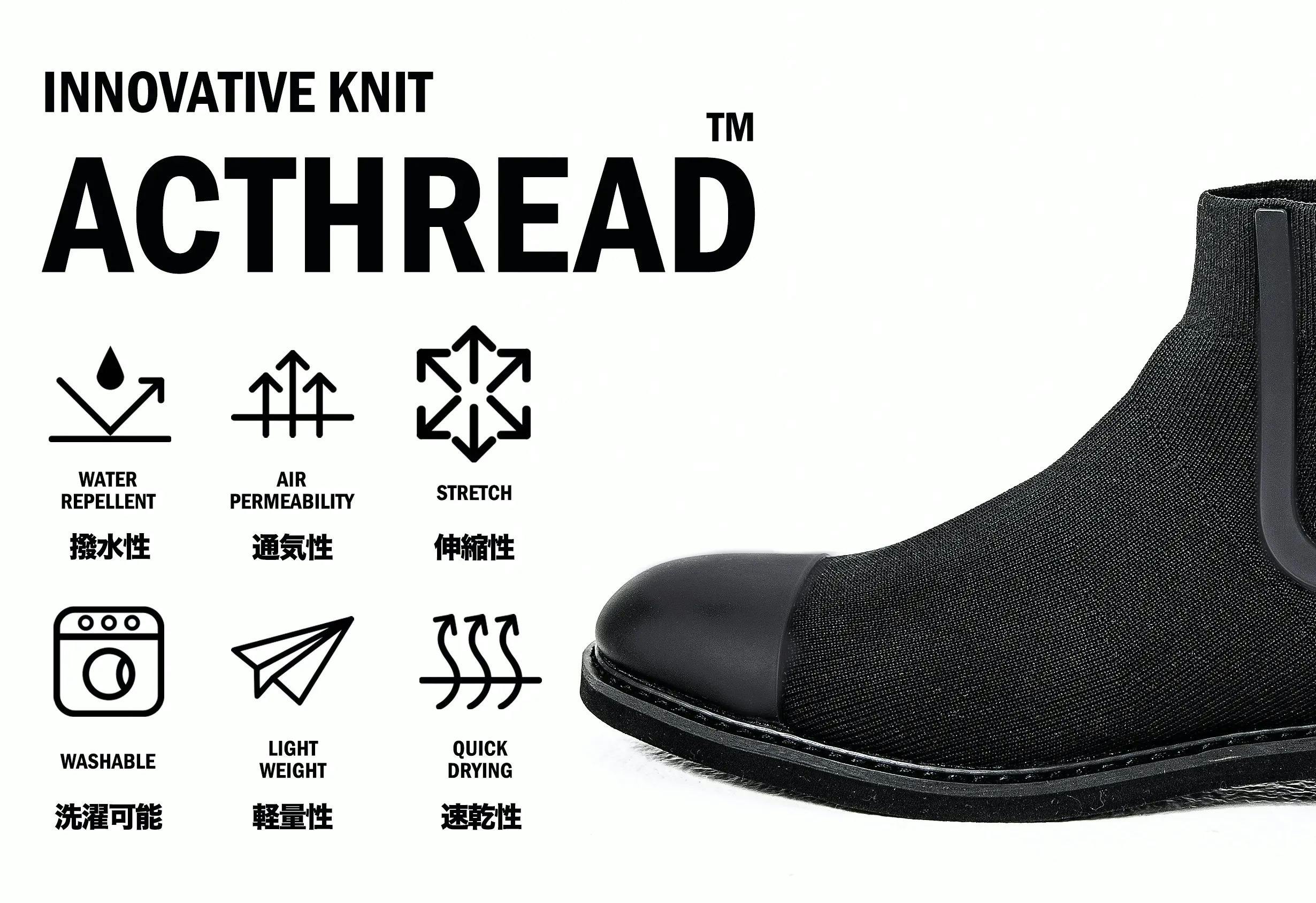 今回の「Chelsea Boots」では、ハイテクニット素材アクスレッドを活用することで、通気性が良いうえに水にも強いブーツが完成しました。