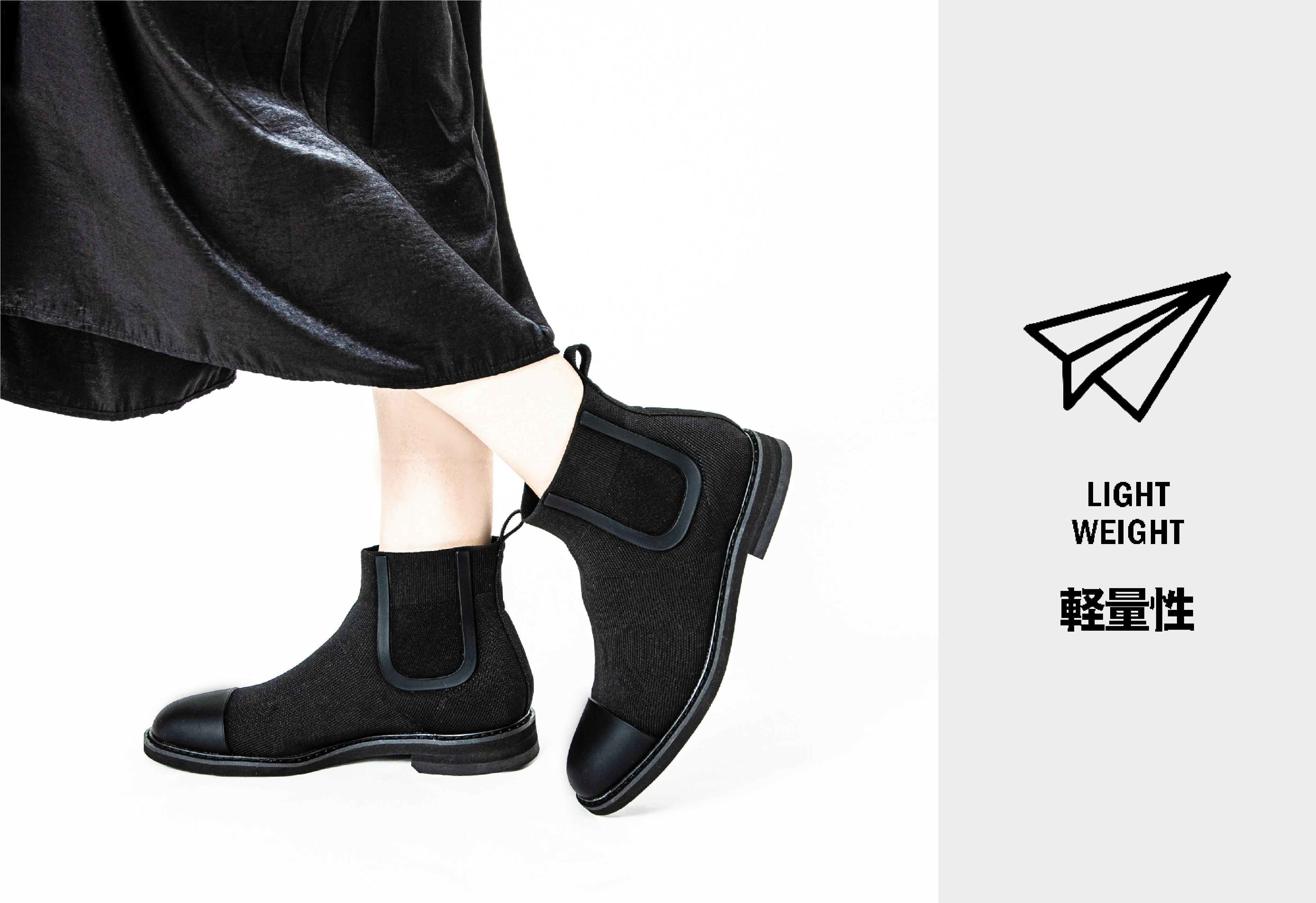 一般的なビジネスシューズのアッパー部分は硬いレザーであるのに対して、「Chelsea Boots」はニット素材のため足あたりが柔らか。靴の中で足があたって痛くなる心配は無用です。