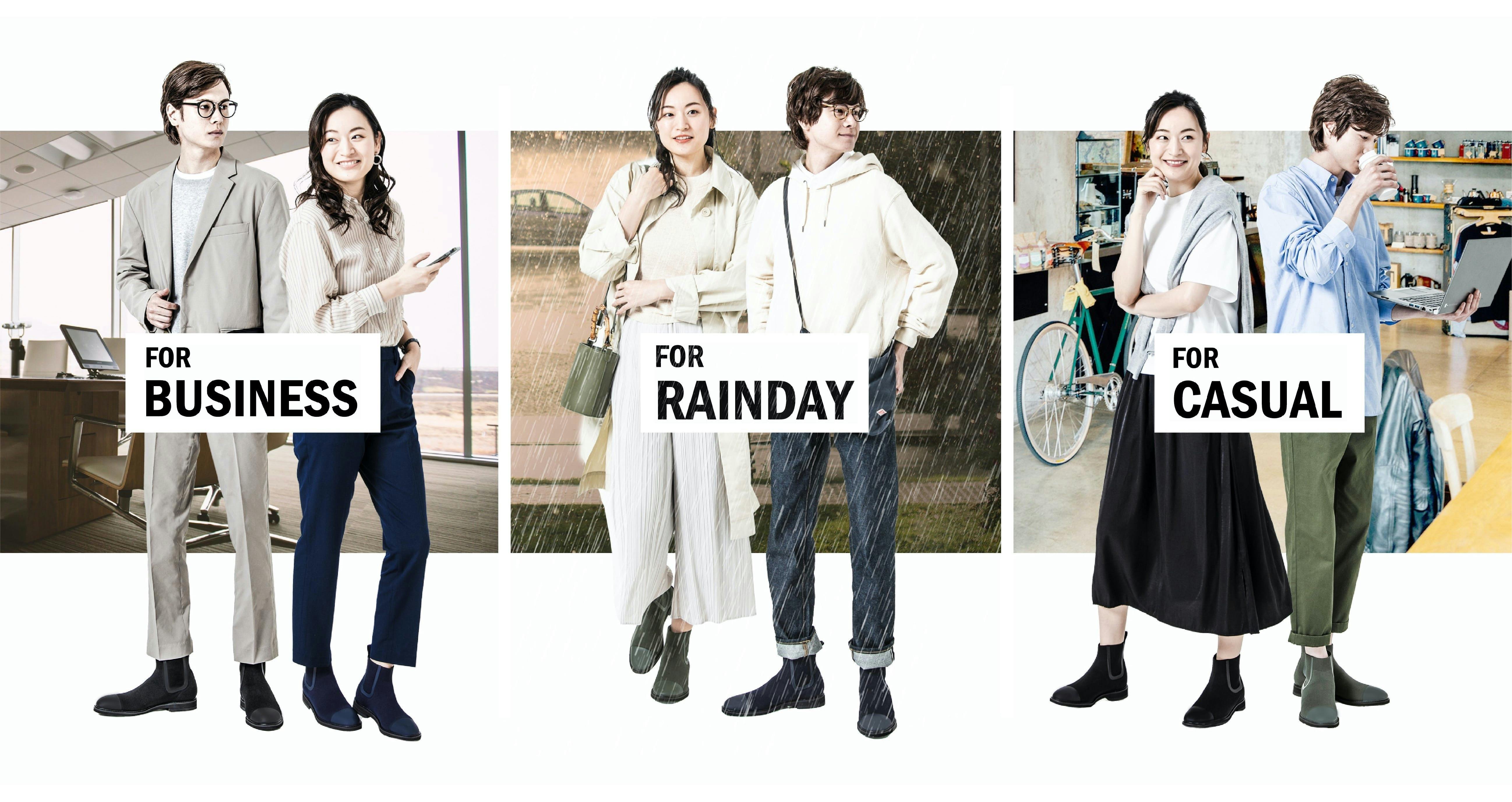 雨で少し憂鬱な気分の日にも、気分を変えたいお仕事の日にも、街へ出かける休日にも「Chelsea Boots」をお使いいただけます。