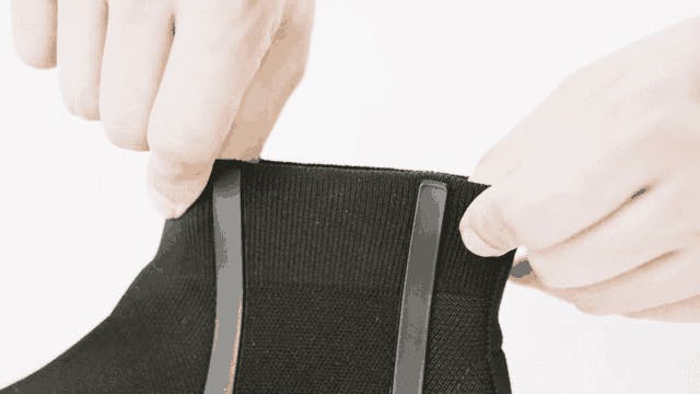 足首部分のデザインの最大の特徴は、U字に配置した樹脂パーツの内側部分と外側部分を、伸縮性のある糸と形状をしっかりと形作る糸を使い分けながら一体編みをしている点です。そのため接合部分がなく、水の侵入を防ぐことが可能に。足あたりも良く、フィット感もしっかりしています。