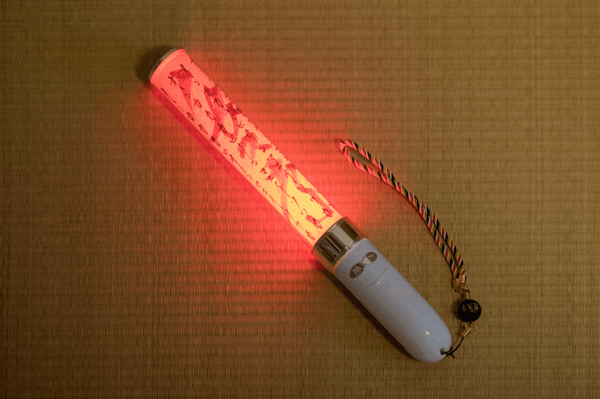 ライブ会場で大活躍の心願光明灯(しんがんこうみょうとう・ペンライト)です。光明部に書かれた「オンカカカビサンマエイソワカ」とは、長久寺本尊地蔵菩薩さまのご真言で一文字につき千の意味を持つ大変ありがたいお言葉です。このご真言を心で唱えながら、一心に推しに想いが届くよう振って応援して下さい。(18色に点灯します。この数字は、偶然にも観音さまのご縁日と同じです。)こちらも、ひとつひとつに想いを込めてご真言を書きあげ、ご祈願の後にお送りいたします。尚、ストラップ部分には黒檀の珠に寺名と推し活ロゴを配し、紐の部分は仏さまをお迎えする際に結界として使用する壇線をイメージしたものとなっております。