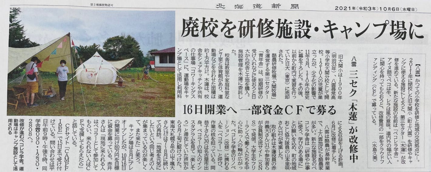 2021/10/13 08:30☆ペコレラ学舎を応援してくださる皆様☆おはようございます!広報チームの長谷川です。今日は、少し前のことですが、新聞に掲載していただいたのでそのご紹介です。★北海道新聞 10月6日「廃校を研修施設・キャンプ場に 八雲三セク「木蓮」が改修中」★朝日新聞 9月28日「旧小学校で仕事にキャンプ、北海道八雲町の「ペコレラ学舎」とは」https://www.asahi.com/articles/ASP9W5Q4SP9GIIPE00M.html(会員記事)道内・全国でも注目していただき、身の引き締まる思いです…!---いよいよペコレラ学舎のクラウドファンディングも残り2日となりました。なんとこの1週間でおよそ30人もの方々に支援していただきました。ありがとうございます!残り2日で目標達成まで駆け抜けたいと思っておりますので、ぜひFB・Twitter・note等のシェアをよろしくお願いします!★Facebook コワーキングスペースの紹介https://www.facebook.com/1484685118/posts/10226550080606637/?d=n★Twitter 進化し続ける廃校https://twitter.com/pekolela_yakumo/status/1448053205661675521★note ペコラー紹介https://note.com/pekolela/n/naf734f558a32 もっと見る