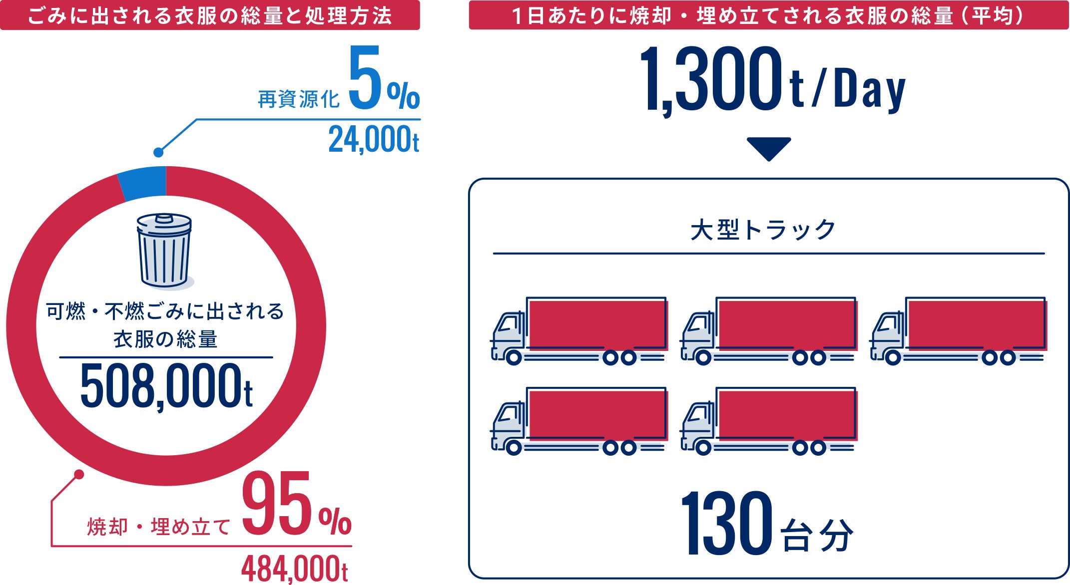 現在の日本では,年間48万トン以上もの廃棄衣料が,焼却や埋立ての方法で,処分されています。そのCO2排出量を考えると,地球にやさしい処分方法であるとは言えません。