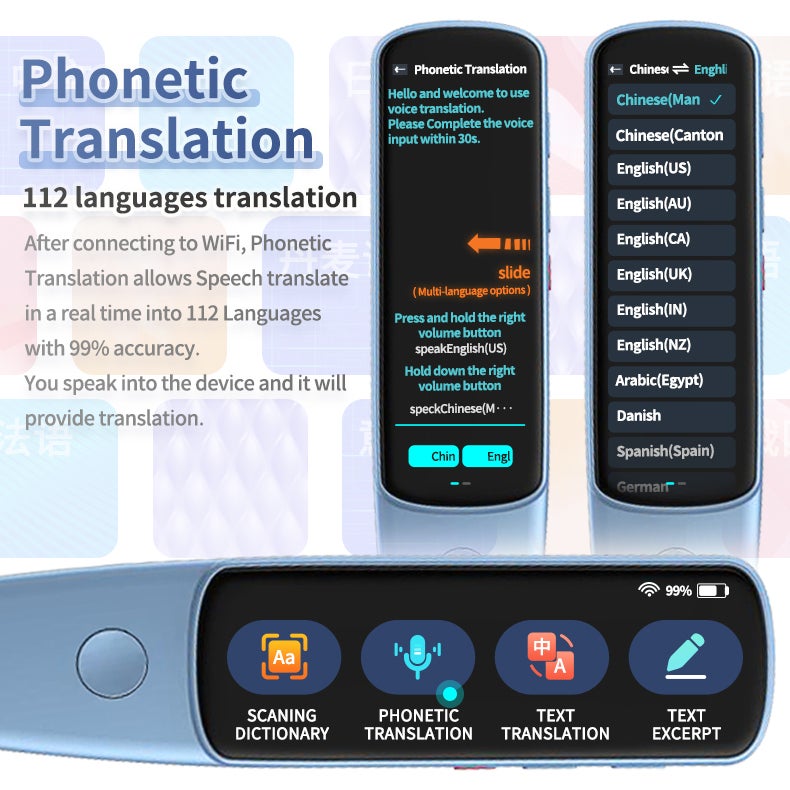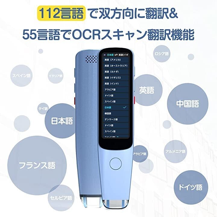 T-PEN 2.0は、プロフェッショナルな手持ち型翻訳デバイスです。112の言語に対応しており、紙面や画面を問わずどこからでも文字をスキャンできる上、リアルタイムでの双方向音声翻訳にも対応しています。また、オフラインモードにも対応しているため、インターネットが使えない場所でもご使用いただけます。スマートな録音機能も備えており、重要な会議をT-PEN 2.0で録音した後はその音声を文字に起こせます。T-PEN 2.0で、世界中の人々との言葉の壁を乗り越えましょう。