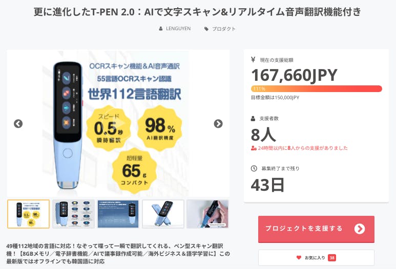 2021/10/03 08:00この度は「更に進化したT-PEN 2.0:AIで文字スキャン&リアルタイム音声翻訳機能付き」にご支援頂き誠にありがとうございます!皆様のご支援のおかげで、目標金額100%を達成することができました。BRIGHTチームは当プロジェクトをより多くの方へ知って頂きたいと考えております。よかったら、FacebookやTwitter等のSNSでのシェア・拡散をお願い致します。https://camp-fire.jp/projects/view/475400どうぞよろしくお願い致します。BrightDIYチーム もっと見る
