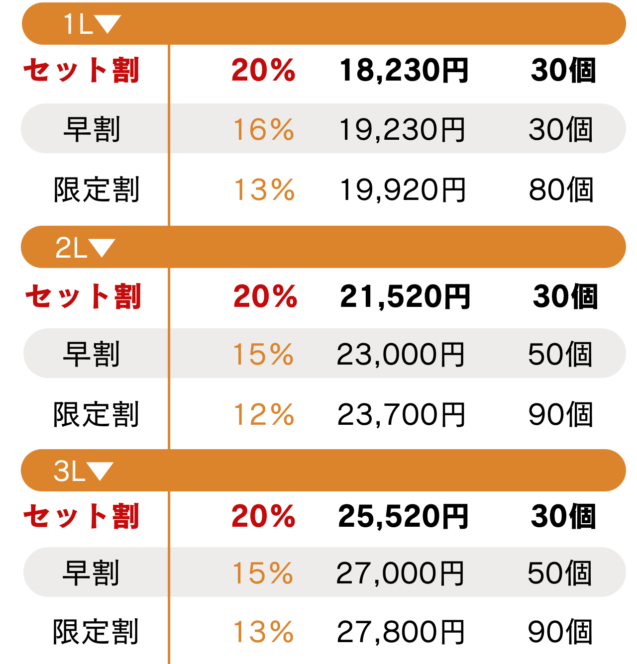 セット割は単品よりさらにお得な20%OFFでご用意いたしました。