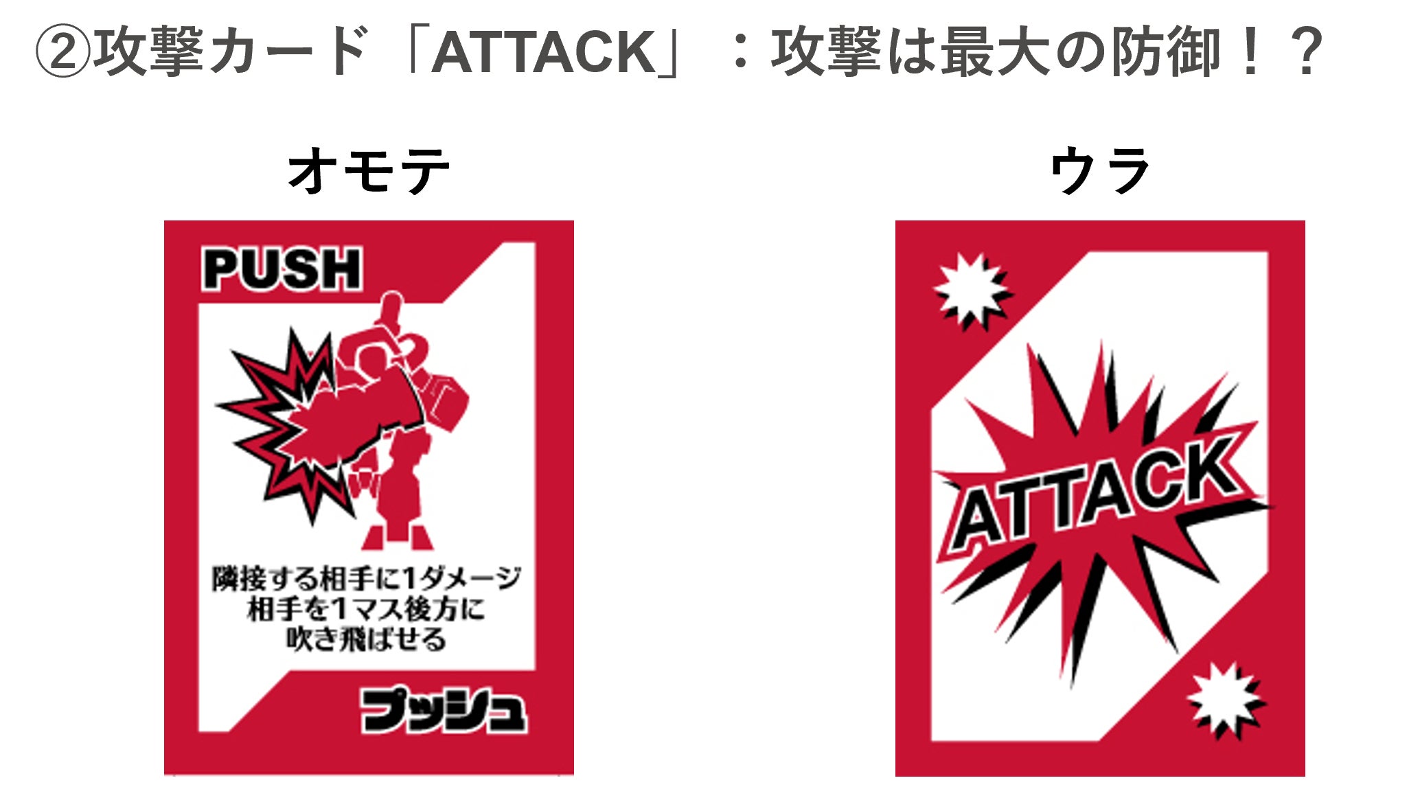 攻撃カードは相手を攻撃するときに使用するカードで、隣接攻撃か間接攻撃かが区別されています。