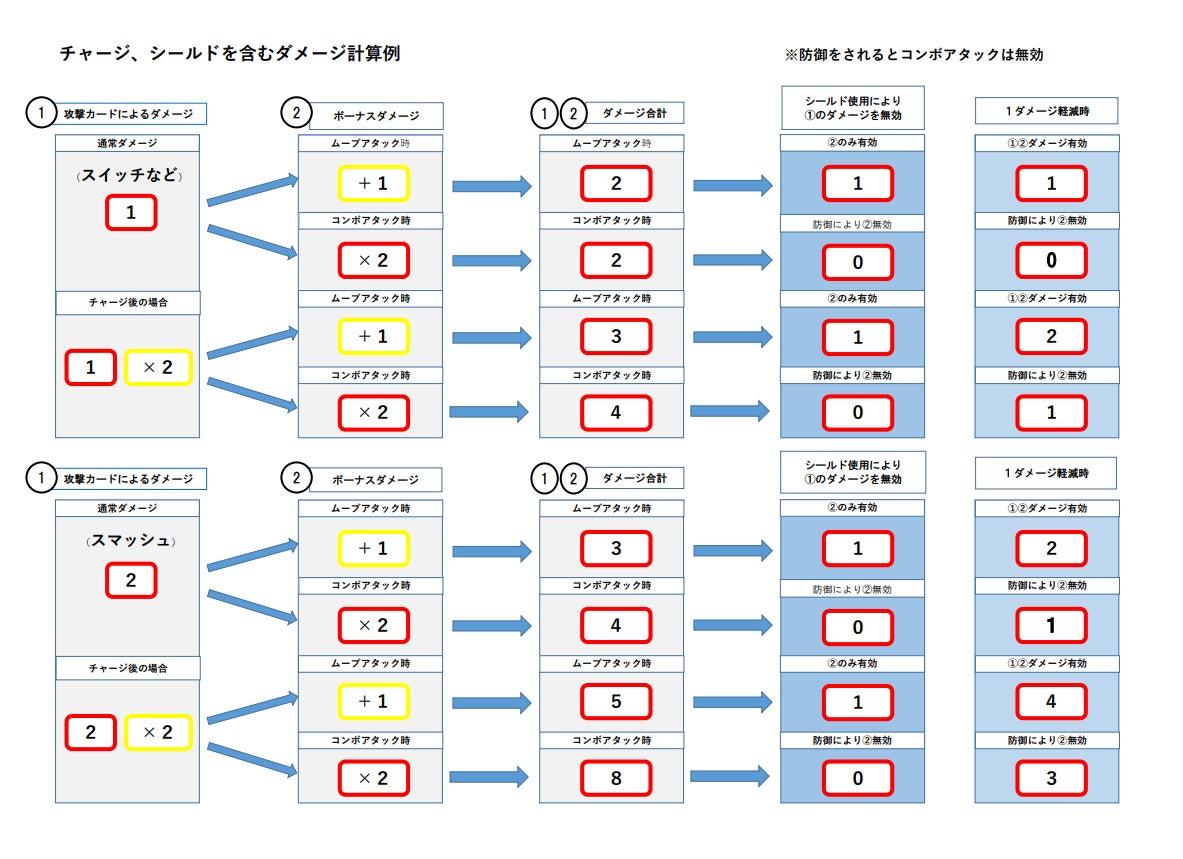 2021/11/29 12:00『マシグラ』にご支援頂いた皆様、ご興味を持って頂いた皆様、いつも応援ありがとうございます。マシグラをプレイするにあたり、分かりづらいところや、併せて表記を訂正した方がいいと思われる内容を纏めました。チャージやカウンターなどダメージが2倍になる際の効果対象など、分かりづらいものについては上記イメージを参考にして頂ければと思います。それ以外のものについては、下記にQ&Aとして記載しておりますので、ご確認ください。お手数をお掛けして申し訳ありませんが、よろしくお願いします。【カード効果の表記訂正】------------------------------------------------・チャージ誤:移動0マス 次のターンの攻撃ダメージが2倍になる ターンを終了する正:移動0マス 次のターンの攻撃カードによるダメージが2倍になる ターンを終了する------------------------------------------------・シールド誤:ダメージ無効 攻撃カード1回分のダメージを受けない正:攻撃カードによる1回分のダメージを無効化する------------------------------------------------【Q&A】ATTACKカード編------------------------------------------------Q:スイッチ攻撃は場所を入れ替わらない選択もできますか?A:可能です。そのため、”入れ替われる”という表現にしています。------------------------------------------------Q:スイッチ攻撃をクリンチで防御した場合、どちらの効果が優先されますか?A:クリンチには”入れ替わらせない”という効果があるため、クリンチの効果を優先します。------------------------------------------------Q:プッシュ攻撃は吹き飛ばさない選択もできますか?A:可能です。そのため、”吹き飛ばせる”という表現にしています。------------------------------------------------Q:プッシュ攻撃をクリンチで防御した場合、吹き飛ばしの処理はどうなりますか?A:まず防御側がカードの効果であるダメージを1軽減し、その後クリンチの効果による場所の入れ替えの有無を決定します。その後攻撃側が相手を吹き飛ばすかどうかを判断し処理を行います。------------------------------------------------Q:1回目にトラップ以外の攻撃をした場合に、2回目にトラップを使用することはできますか?A:いいえ。トラップを使用するターンはそれ以外の攻撃カードを使用することはできません。------------------------------------------------DEFENCEカード編------------------------------------------------Q:シールドはどこまでの攻撃を無効化できますか?A:シールドでは”攻撃カード”のダメージのみを無効化するため、間接攻撃により起動されたボムの爆風、吹き飛ばしによる場外ダメージ、ムーブアタックによる加算ダメージは無効化できません。------------------------------------------------Q:エスケープは攻撃カードの効果も回避できますか?A:はい。ダメージだけでなく効果も回避します。ただし、フェイント攻撃により防御カード自体が出せないときには回避もできません。------------------------------------------------Q:エスケープの効果は回避した後のマスでも有効ですか?A:いいえ。回避した後のマスでは通常判定となりますので、回避後のマスがボムの爆風の範囲内であれば爆風のダメージを受けてしまいます。------------------------------------------------Q:ボムの爆風は防御できますか?A:ボムの自動爆発は防御カードを使用できません。ボムの起動を目的として行われた攻撃カードには防御カードを使用することができます。その場合、1)クリンチ、ジャミングによるダメージ軽減は可能です。2)エスケープによる回避は可能ですが、回避先のマスが爆風の範囲内である場合には、そこでのダメージは受けることになります。3)シールドによるダメージ無効は、攻撃カードによるダメージにしか効果がないため、ボムの爆風は無効化できません。------------------------------------------------MOVEカード編------------------------------------------------Q:ムーブ3での自由に3マス移動では1マスだけ、2マスだけの移動も可能ですか? A:いいえ。3マス移動では必ず3マスの移動をします。------------------------------------------------Q:チャージ後のダメージ2倍は、すべてのダメージが2倍になりますか?A:いいえ。攻撃カードのダメージ分のみ2倍になります。※実際のカードには”攻撃カードの”という表記がありませんでしたので、読み替えて頂ければと思います。------------------------------------------------上記以外にも分かりづらいことがありましたら、当サイト内のメッセージ機能やTwitterへのDMなどにご連絡ください。今後とも、どうぞよろしくお願いいたします。 もっと見るプロジェクト成功!リターン品の発送をいたしました!