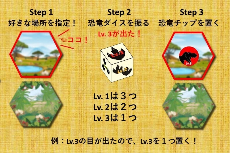 配置したい恐竜のLv.を選択し、エリアダイスを振ります。出た目のエリアにあらかじめ選択しておいたLv.の恐竜チップを配置します。このとき恐竜チップを置く数はLv.3なら1つ、Lv.2なら2つ、Lv.1なら3つです。