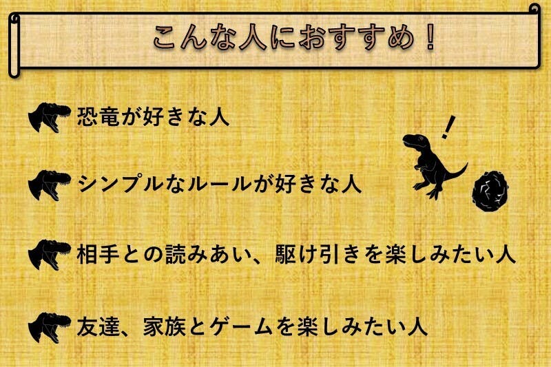 恐竜の生き残りを懸けた戦いをモチーフにしたゲームです。「シンプルなルール」でありながら「熱い駆け引き」を楽しめるゲームデザイン。ワクワクする世界観と面白さの仕掛けを理論的に組み立てた集大成です。ボードゲームが好きな方はもちろん、初めてボードゲームに触れる方へもおすすめの作品です。