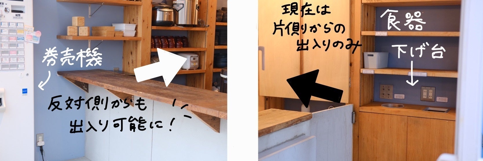 現状、まちの社員食堂の厨房スペースは店内の奥、中庭側一箇所しか出入り口がありません。お客様自身に食器を下げていただく導線とぶつかってしまい、ご迷惑をお掛けすることも多くありました。状況に応じて出入り口を変え、対面接触を減らすことが出来ると考えています。