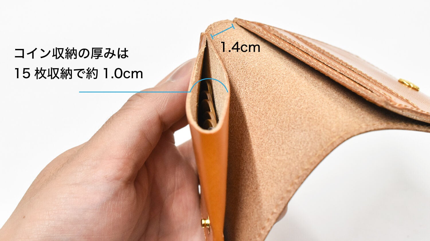 中央に取った1.4cmの空間が、蓋のないコインポケットを可能にしています。