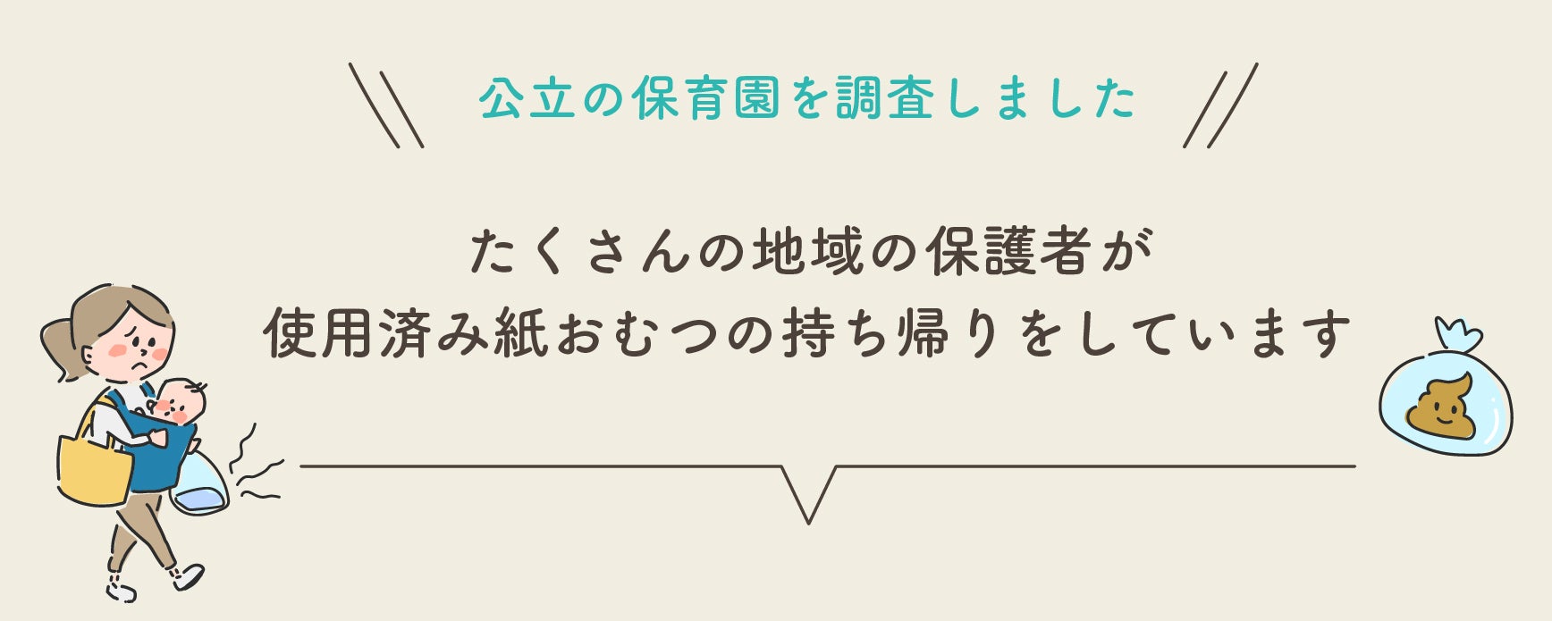 仕事をしている人しか保育園に子どもを預けられないため、仕事の荷物を持った状態で使用済み紙おむつを持ちかえる人が大半だと思います。もちろん荷物の量が多くなることの負担もありますが、それ以上に衛生面や臭いの面で悩みを抱える保護者が非常に多いです。